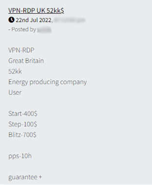A recent example, provided by Searchlight Security, found a user selling credentials relating to a UK-based energy company.
