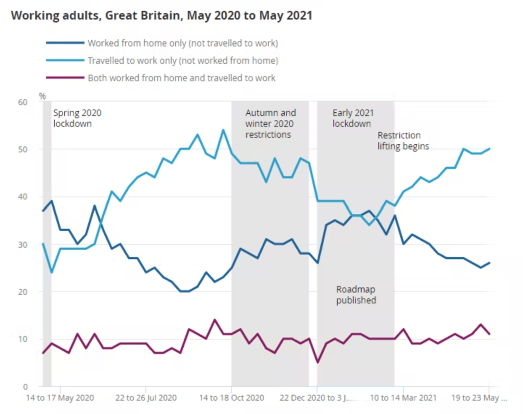 The findings show that, post-lockdown just under 40% of the UK’s overall workforce worked from home as restrictions eased in 2020, an increase from 27% the previous year (or pre-pandemic).